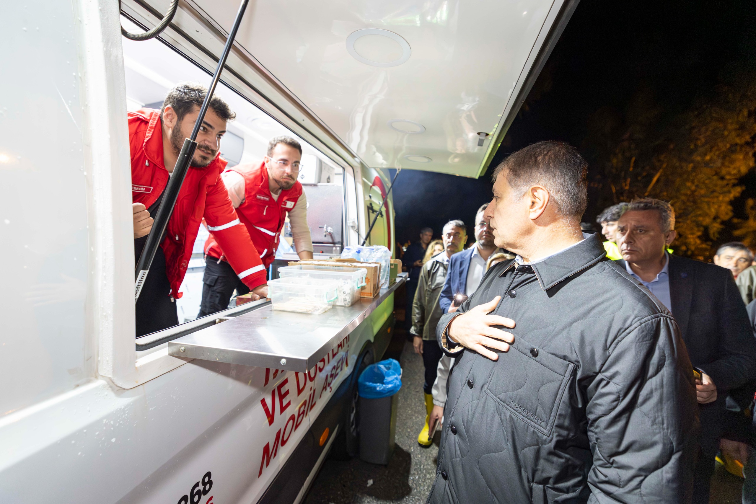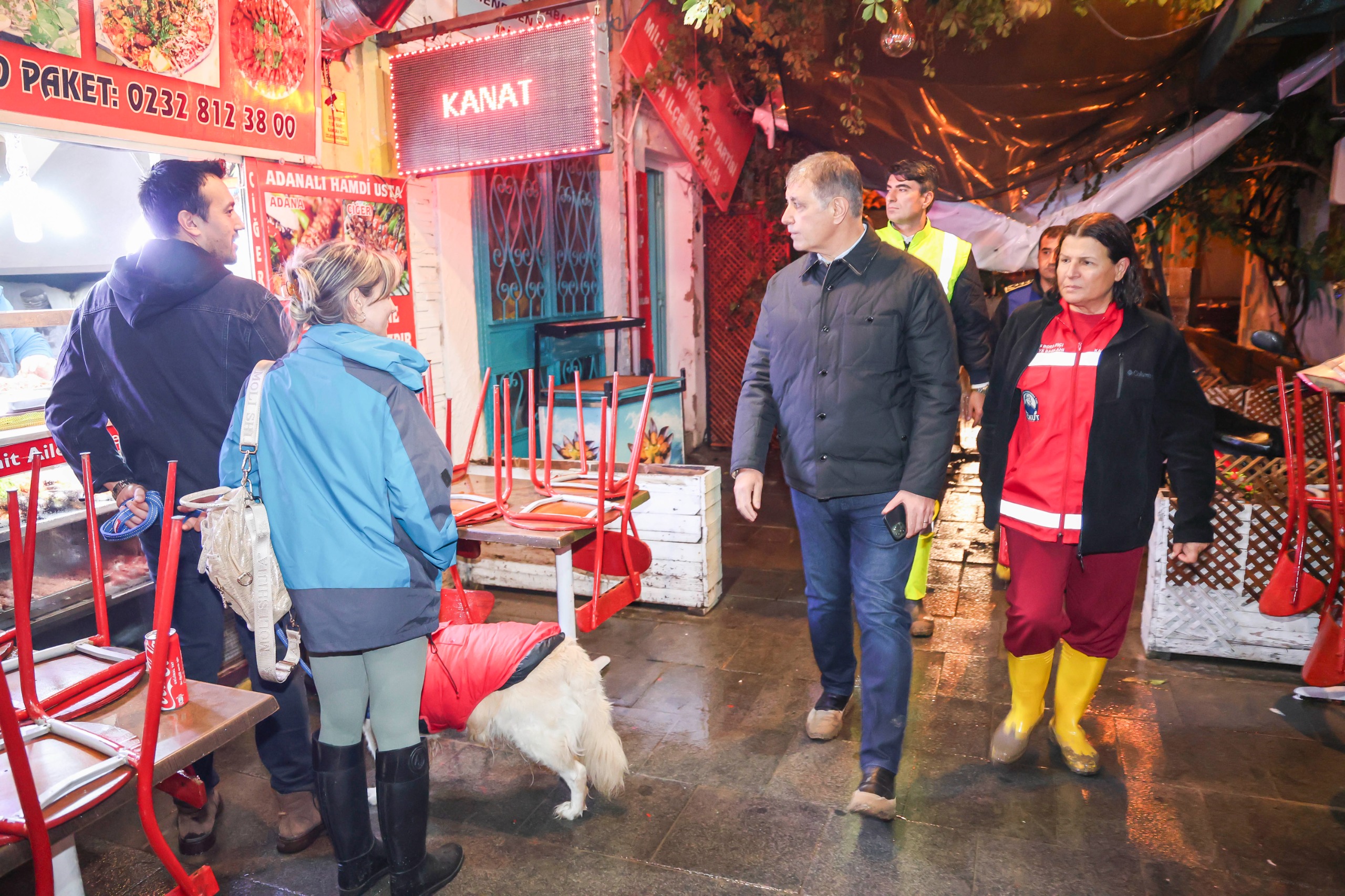 Başkan Tugay, mağduriyet yaşayan esnaf ve yurttaşları ziyaret ederek eksikliklerin giderilmesi için talimat verdi. Büyükşehir ekipleri, ilçede 197 araç ve 350 personelle yaşamı normale döndürmek için var gücüyle çalışıyor.