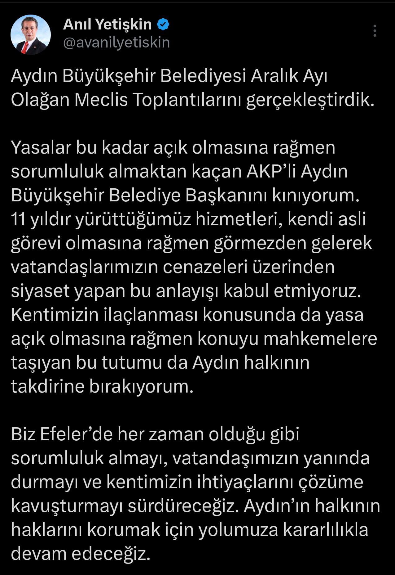 Konuyla ilgili sosyal medya hesabından paylaşım yapan Başkan Yetişkin, “Yasalar bu kadar açık olmasına rağmen sorumluluk almaktan kaçan AKP’li Aydın Büyükşehir Belediye Başkanını kınıyorum” dedi.