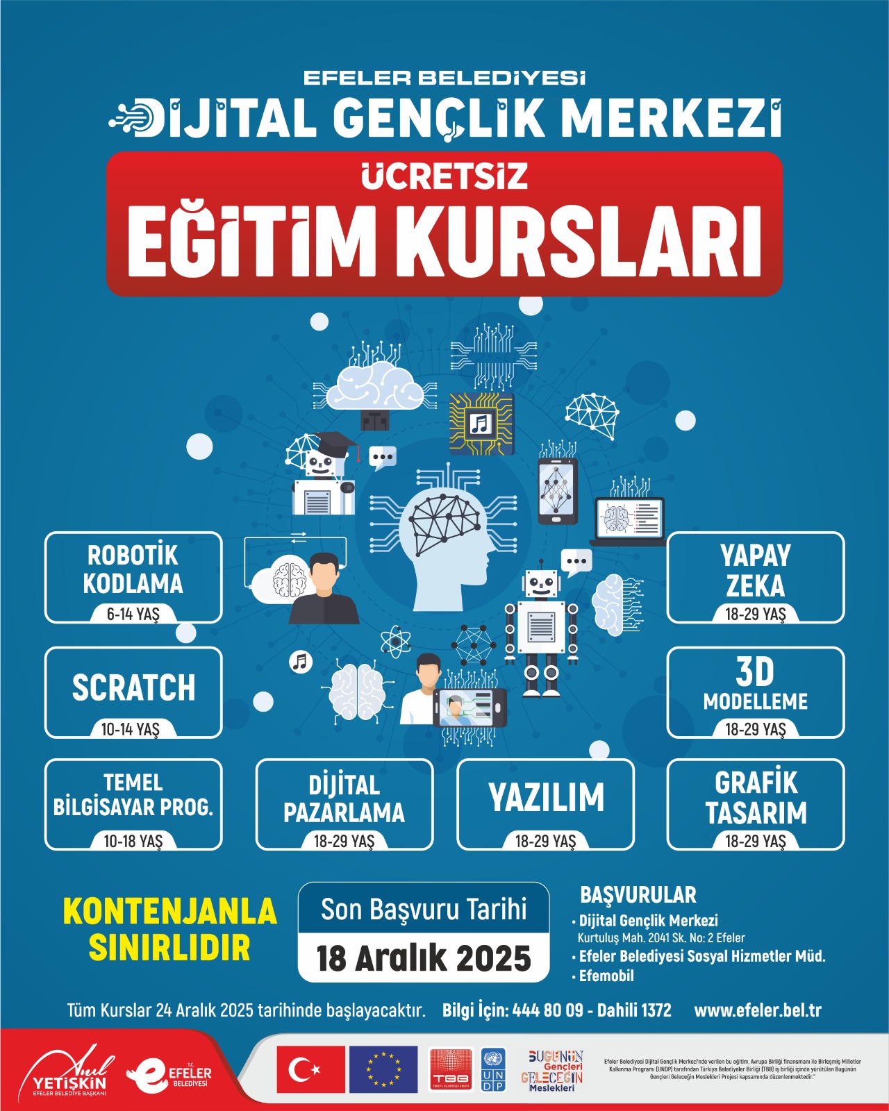 Başvurular; Kurtuluş Mahallesi 2041 Sokak No: 2 adresinde hizmet veren Dijital Gençlik Merkezi, Efeler Belediyesi Sosyal Hizmetler Müdürlüğü ve Efemobil üzerinden yapılabiliyor. Başkan Yetişkin, gençleri geleceğin mesleklerine hazırlayacak bu ücretsiz programla teknolojiye erişimi artırmayı, fırsat eşitliği sağlamayı ve ilçenin genç nüfusuna destek sunmayı hedefliyor. Başkan Anıl Yetişkin, “Gençlerimizin dijital çağa ayak uydurmasını değil, bu çağın öncüsü olmasını istiyoruz. Efeler Belediyesi olarak her zaman gençlerimizin yanındayız.” diyerek tüm gençleri kurslara davet etti.