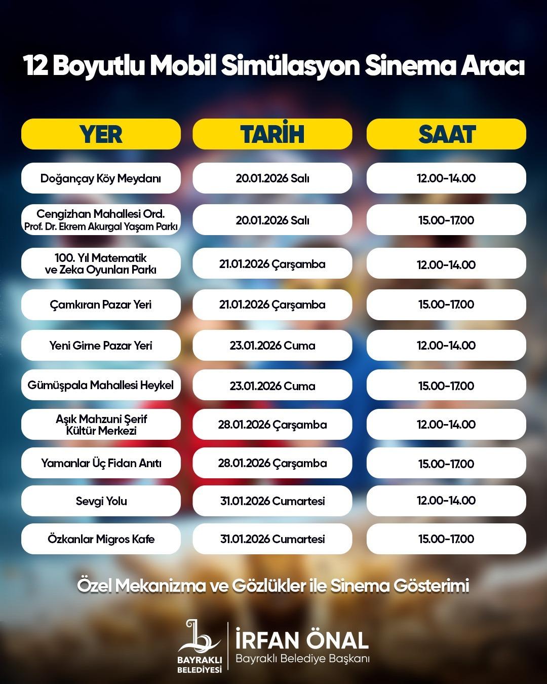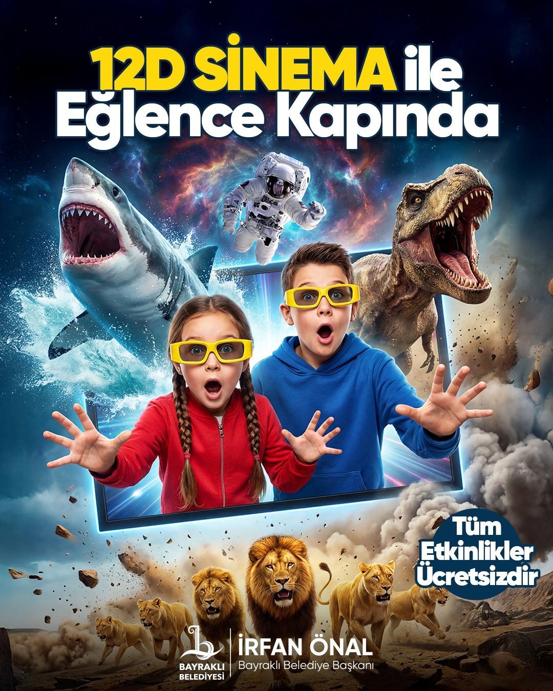 Bu kapsamda Bayraklı Belediyesi tarafından hayata geçirilen 12D Mobil Simülasyon Sinema Aracı, sömestr tatili süresince mahalle mahalle gezerek çocuklarla buluşuyor. Özel mekanizma ve gözlükler eşliğinde sunulan sinema gösterimleriyle çocuklara heyecan dolu, farklı bir sinema deneyimi yaşatılıyor. Etkinlikler, tatil boyunca ilçenin farklı noktalarında ücretsiz olarak gerçekleştiriliyor.
