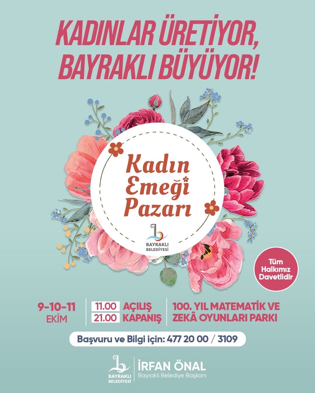 100. Yıl Matematik ve Zeka Oyunları Parkı’nda düzenlenecek etkinlikte, uygun fiyatlı birçok ürün üç gün boyunca sergilenecek ve 11 Ekim tarihine kadar ziyaret edilebilecek. Bayraklı Belediye Başkanı İrfan Önal, “Özveriyle üretilen birbirinden güzel ürünleri görmek ve Bayraklı’nın üreten kadınlarına destek olmak için tüm vatandaşlarımızı stantlarımıza davet ediyoruz” dedi.
