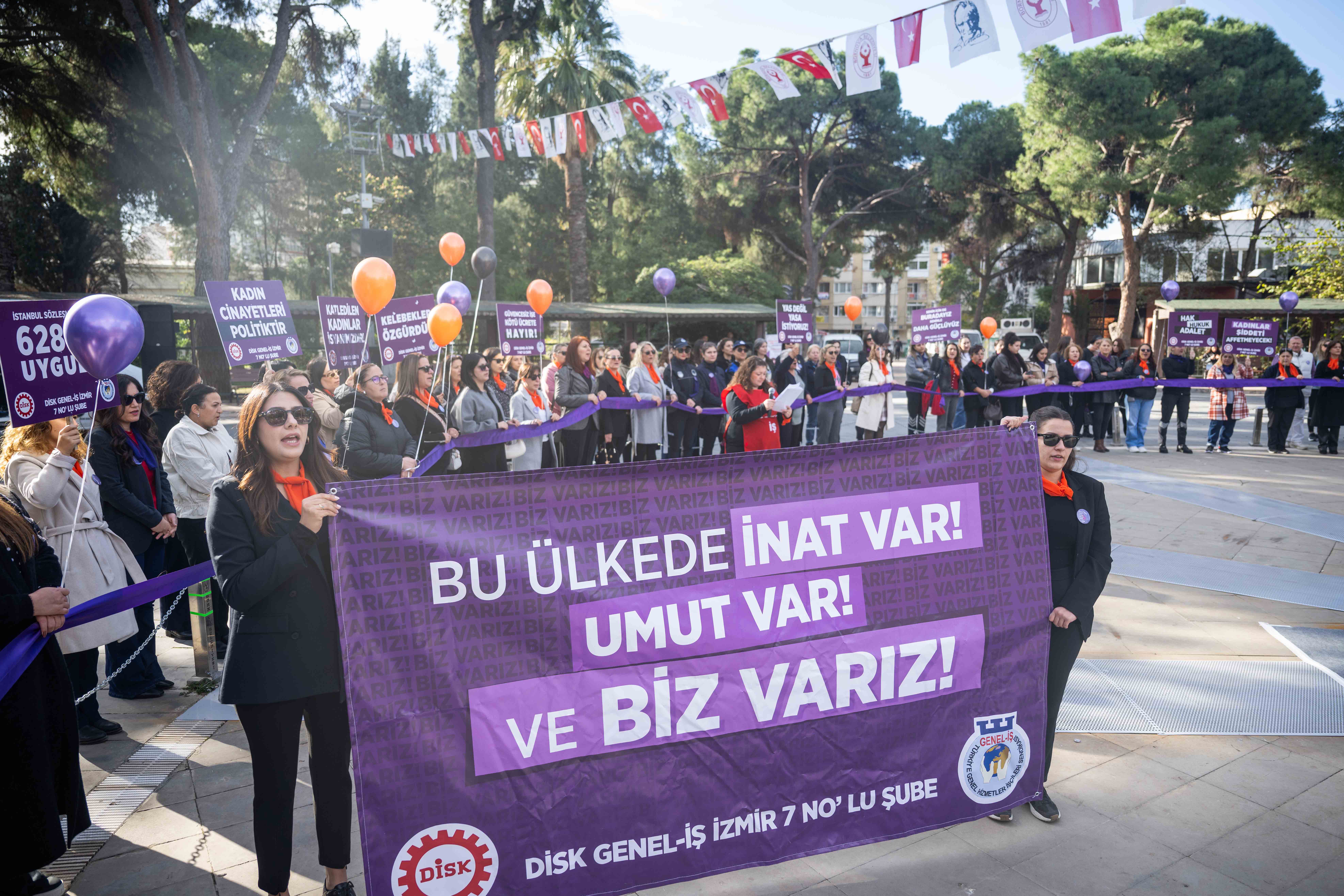 Bornovalı emekçi kadınların 25 Kasım buluşması ise Büyükpark’ta düzenlendi. Etkinlikte DİSK Genel İş 7 No’lu Şube Kadın Komitesi Başkanı Gülistan Tilkici hazırlanan bildiriyi okudu. Kadına yönelik şiddet tiyatral bir sunumla ele alınırken, katılımcılar sloganlar atarak dayanışmanın gücünü ortaya koydu. Program, balonların hep birlikte gökyüzüne bırakılmasıyla simgesel bir mesajla sona erdi.