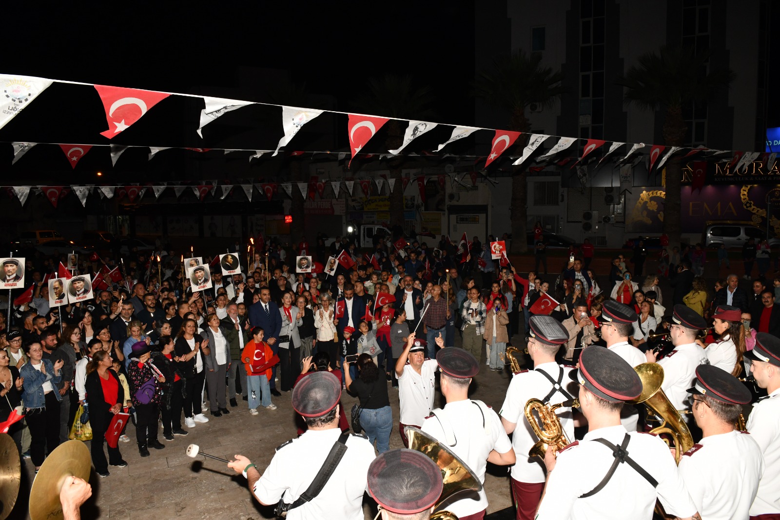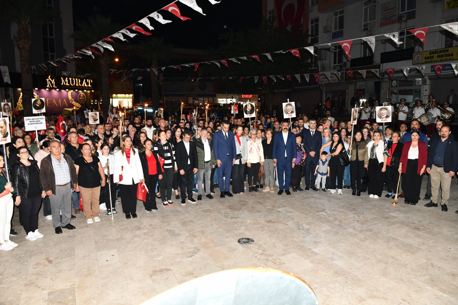 Cumhuriyet ve Demokrasi Parkı’ndan başlayan kortej, bando eşliğinde çalınan marşlar ve meşalelerin ışığında, eski belediye binası önündeki Atatürk Heykeli’nde son buldu.