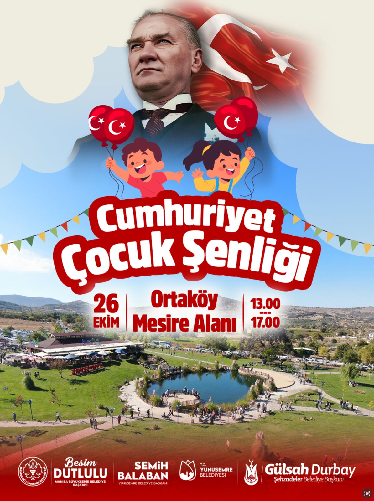 Ücretsiz olarak düzenlenecek etkinliğe tüm Manisalıları davet eden Yunusemre Belediye Başkanı Semih Balaban, “Cumhuriyetimizin 102. yılını çocuklarımızın gülümsemeleriyle taçlandırmak istiyoruz. Her yıl olduğu gibi bu yıl da Cumhuriyet Bayramı coşkusunu halkımızla, özellikle de geleceğimizin teminatı çocuklarımızla paylaşacağız. 26 Ekim Pazar günü saat 13.00–17.00 arasında Ortaköy Mesire Alanı’nda düzenleyeceğimiz şenliğe tüm halkımızı bekliyoruz” dedi.