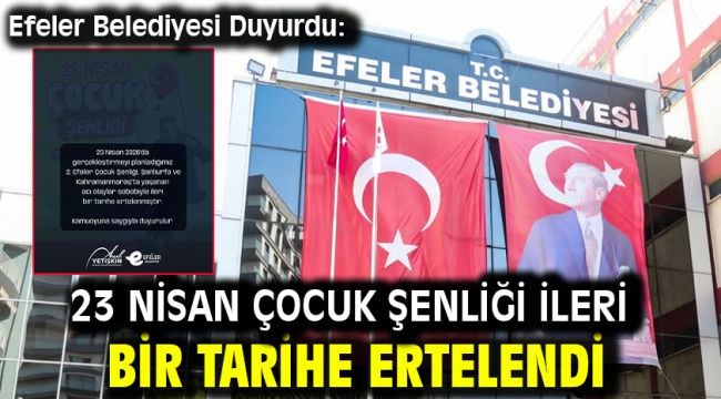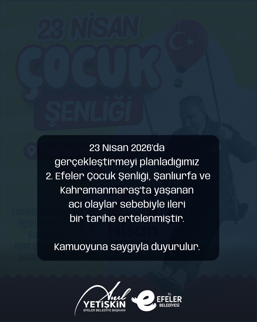 "23 Nisan 2026'da gerçekleştirmeyi planladığımız 2. Efeler Çocuk Şenliği, Şanlıurfa ve Kahramanmaraş'ta yaşanan acı olaylar sebebiyle ileri bir tarihe ertelenmiştir. Kamuoyuna saygıyla duyurulur.”