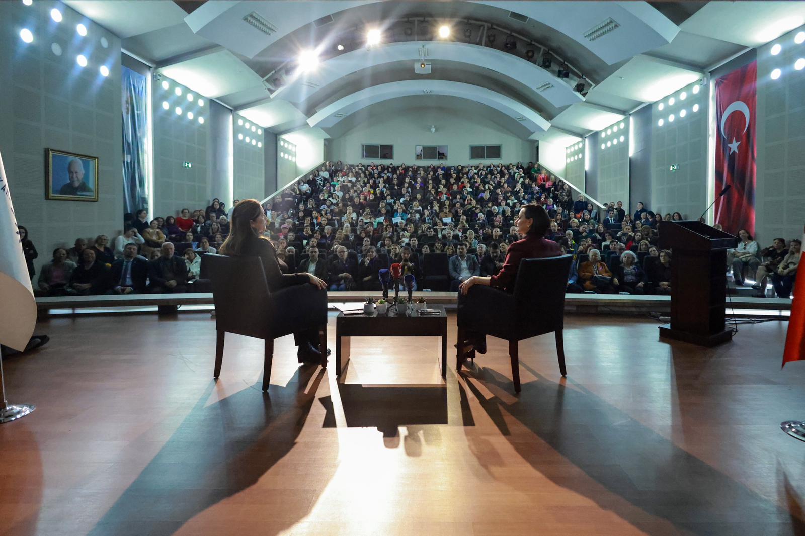 Katılan izleyicilerin soru ve cevap şeklinde devam eden forumun sonunda Başkan Kınay, Arzu Çerkezoğlu’na çiçek ve Karabağlar Mobilya ustalarının yaptığı ahşap oyma çınar yaprağı hediye etti.