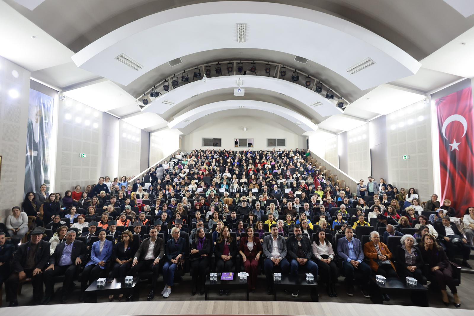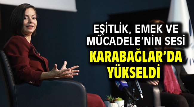 Muzaffer İzgü Konferans Salonu’nda gerçekleşen etkinlikte Karabağlar Belediye Başkanı Helil Kınay ve DİSK’in ilk kadın başkanı Arzu Çerkezoğlu, kadınların çalışma hayatındaki hakları ve örgütlenmenin önemine dikkat çekti.