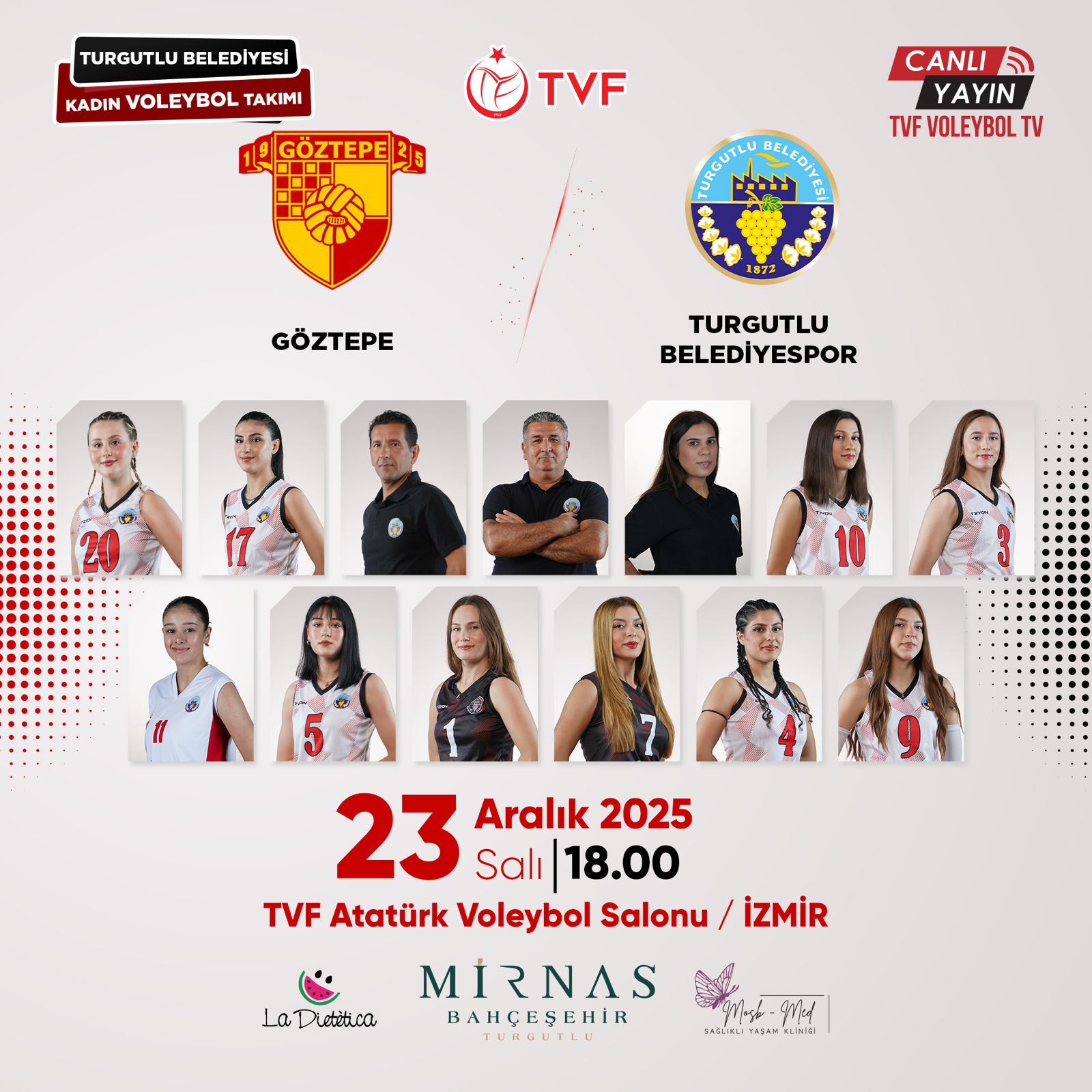 Turgutlu Belediyesi Kadın Voleybol Takımı, 23 Aralık Salı günü Göztepe ile karşı karşıya gelecek. İzmir TVF Atatürk Voleybol Salonu’nda oynanacak karşılaşma saat 18.00’de başlayacak. İki takımın mücadelesi aynı zamanda TVF Voleybol TV’de canlı olarak da yayınlanacak.