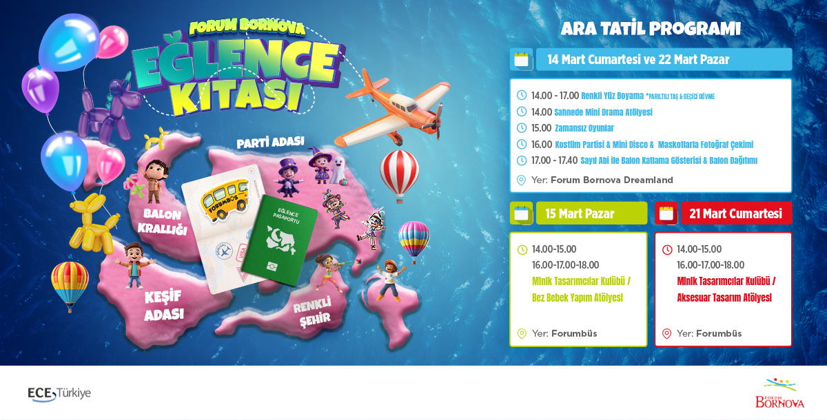 Bu yıl ikincisi düzenlenecek “Eğlence Kıtası”, 14 ve 22 Mart tarihlerinde Forum Bornova Kapalı etkinlik alanı Dreamland’de ve Eğlence Kıtası atölye çalışmaları 15-21 Mart tarihlerinde Forumbüs’te gerçekleştirilecek.