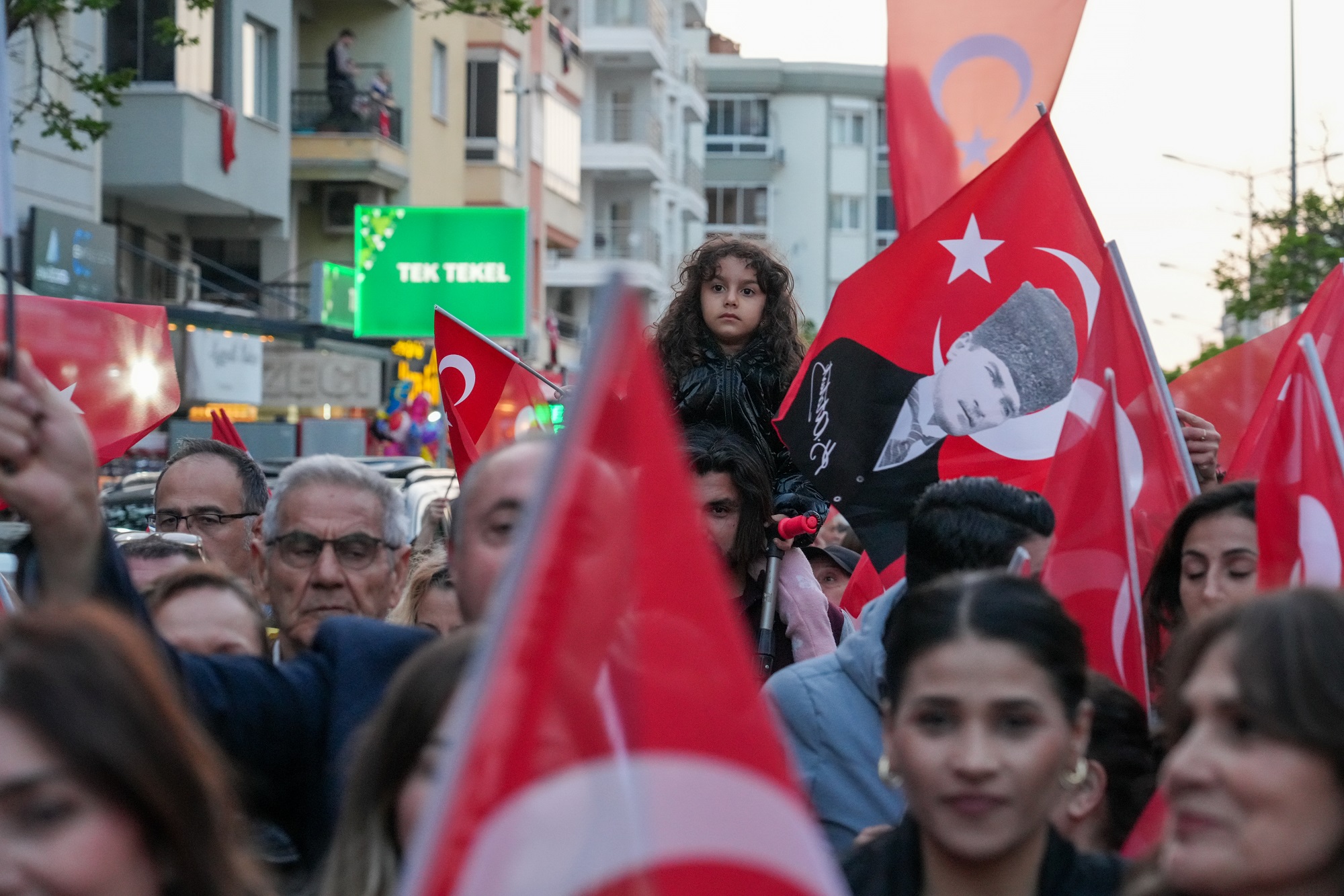 Ellerinde Türk bayraklarıyla, bandonun çaldığı marşları seslendirerek yürüyen vatandaşlar, Türkan Saylan Caddesi’ni adeta gelincik tarlasına çevirdi. Kortej güzergâhındaki evlerinden alkışlarla destek veren yurttaşlar, coşkuya ortak oldu. Büyük boy Türk Bayrağı ve Atatürk posteriyle ilerleyen kortej, marşlar ve şarkılar eşliğinde Festival Alanı’na ulaştı.