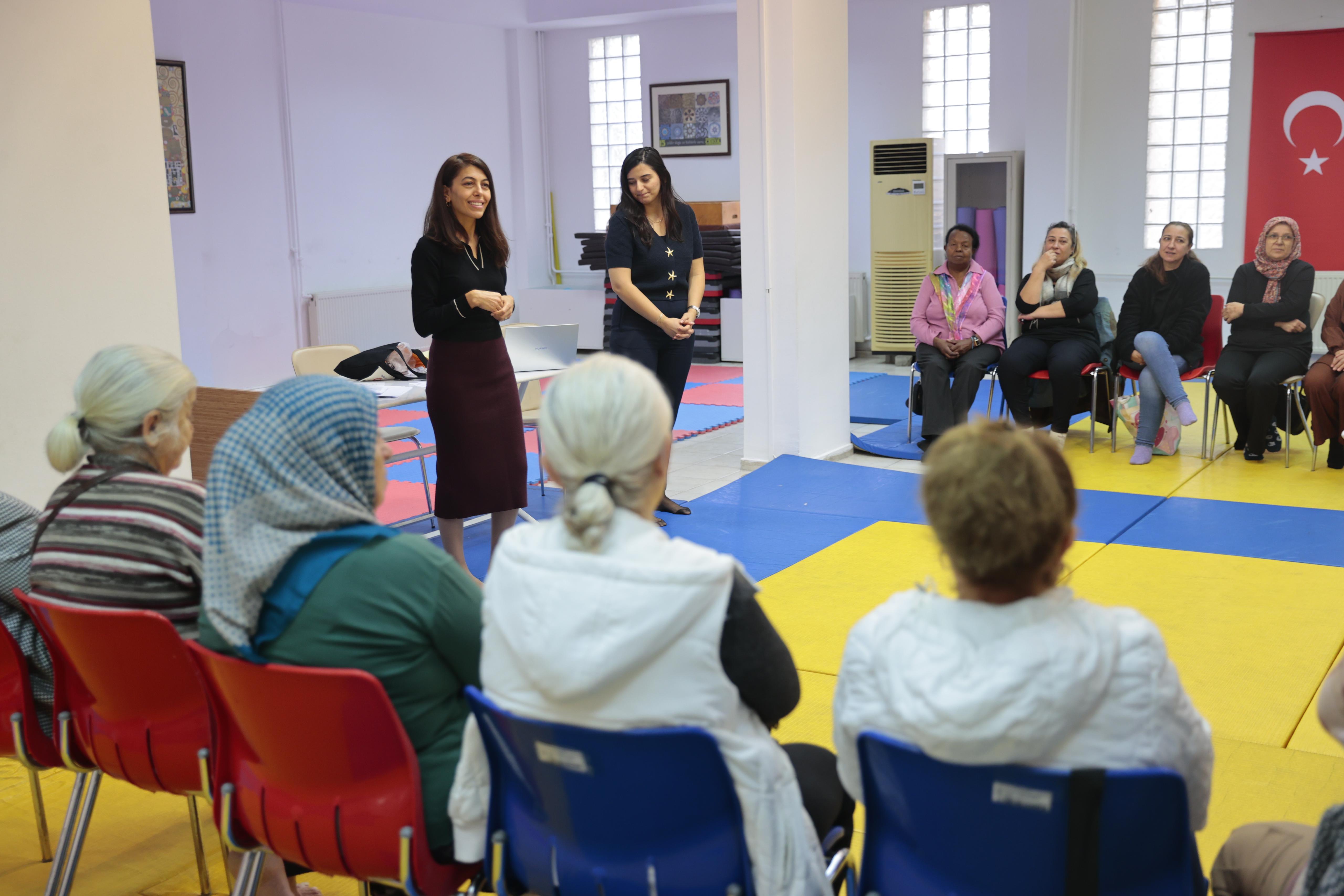 Merkezdeki kurslara devam eden kadınların katılım gösterdiği “Kadına Yönelik Şiddetle Mücadele ve Güvenlik Planı Oluşturma” konulu atölye çalışmasında, Konak Belediyesi Kadın ve Aile Hizmetleri Müdürlüğüne bağlı “Eşitlik ve Kadın Danışma Birimi”nden Sosyal Hizmet Uzmanı Esra Çakıçı Akgün ile Uzman Halk Sağlığı Hemşiresi Aysun Çobadak Çalt yaptıkları interaktif sunumla bilinç ve farkındalık sağladı. Konak Belediye Başkanı Nilüfer Çınarlı Mutlu, 26 Kasım’da düzenlenecek “Kadına Yönelik Şiddetle Mücadelede Belediyelerin Rolü” temalı panel başta olmak üzere tüm etkinliklere kadınları davet ederek, “Konaklı kadınlarla bir araya geliyor, dayanışmamızı büyütüyoruz. Şiddete karşı dayanışmayla güçleniyoruz. Sesimizi güçlendirmek için tüm kadınları farkında olmaya davet ediyoruz” dedi.