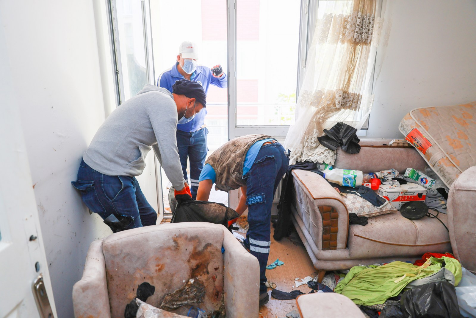 Yaklaşık iki gün süren detaylı temizlik süreci boyunca, evin her köşesi titizlikle temizlenip dezenfekte edildi. Ekiplerin yoğun çabası sonucu evden 2 kamyon çöp çıkarıldı.